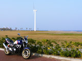 ちょうど後ろの風力発電くるくると重なってしまって良くない。なので重ならない位置まで移動。バイクのエンジンんかけてちょっと乗って動かせばいいのに、「取り回しの練習!」とか言って一生懸命押してバック。やっと駐車スペース2台分後ろに動かしたところで、私の行きたかった場所(更に2台分後ろ)にバイクがやってきて停まった。