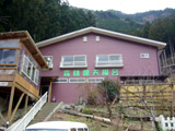コバさんを駐車場の隅っこに停め、大丈夫だろうとは思ったけど念のためロックをかけて、階段を上る。階段の横(画像の左側の建物?)は中が丸見えで、漫画とかがたくさん置いてある。なんじゃここ?と思いながら玄関を開ける。なんだか普通の家みたいだけど…(旅館らしい)。中に女の人がひとりと犬が一匹いた。「温泉に入りたいんですけど」と言うと「どうぞ~」あ、いいんだ。入浴料700円を支払う。犬が寄ってきたのでなでてやった。「かわいいですね~」なんていう犬かわかんないんだけど、コリーの小さい版みたいな。ひとなつっこくてかわいい。
