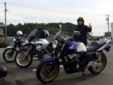 というわけで9:30にうちの近くのコンビニに集合。ほんの3分くらいなのに私は遅刻する始末。大変申し訳ない。そして、(はふ)さんのダンナさん(はも)さんも一緒に行くことになったらしい。(はも)さんのバイクはW650!いいなあぁぁぁ!!「私コレ欲しかったの!!」←私が乗れるのはW400だけど。(はふ)さんのバイクはBMWのなんか(ごめんなさいわかりません・汗)。